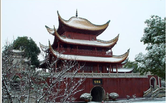 岳陽樓始建于公元220年前后,其前身相傳為三國時(shí)期東吳大將魯肅的“閱軍樓”,西晉南北朝時(shí)稱“巴陵城樓”,中唐李白賦詩之后,始稱“岳陽樓”。此時(shí)的巴陵城已改為岳陽城,巴陵城樓也隨之稱為岳陽樓了。千百年來,無數(shù)文人墨客在此登覽勝境,憑欄抒懷,并記之于文,詠之于詩,形之于畫,工藝美術(shù)家亦多以岳陽樓為題材刻畫洞庭景物,使岳陽樓成為藝術(shù)創(chuàng)作中被反復(fù)描摹、久寫不衰的一個(gè)主題。登岳陽樓可瀏覽八百里洞庭湖的湖光山色。岳陽樓在湖南岳陽洞庭湖西岸,相傳三國時(shí)此地就有閱兵樓,唐代以來詩文更盛,如李白:“樓觀岳陽盡,川回洞庭開”;杜甫:“昔聞洞庭水,今上岳陽樓”等。宋代重修岳陽樓,范仲淹曾撰《岳陽樓記》,樓名更傳揚(yáng)天下。宋岳陽樓僅從現(xiàn)存南宋岳陽樓圖可略見一斑。現(xiàn)存岳陽樓重建于清光緒五年(1879),在岳陽西城墻上,坐東向西,面臨洞庭湖,遙見君山。樓平面矩形,正面三間,周圍廊,三層三檐,通高近20米。屋頂為四坡盔頂,屋面上凸下凹,為中國現(xiàn)存最大盔頂建筑,覆黃琉璃瓦,翼角高翹。樓前兩側(cè)左右與樓品字并列,有三醉亭和仙梅亭作為陪襯。