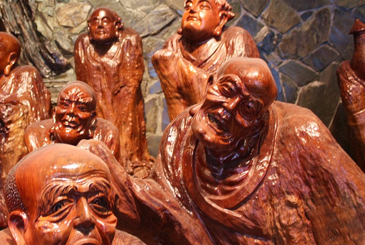 七、五百羅漢簡(jiǎn)介:這套巨型根藝五佰羅漢,是徐谷青大師經(jīng)過(guò)十余年的精心準(zhǔn)備,花巨資收集全國(guó)各地千年龍眼木等根樁創(chuàng)作,風(fēng)格獨(dú)特,氣勢(shì)恢弘,既有佛的神秘,又與人生百態(tài)相映,他們?nèi)宄扇?、或交頭接耳、或悲或苦、或孤座獨(dú)立,或慈眉善目,或閉目凝神,全神貫注,妙相莊嚴(yán);有的胸腹袒露,似笑欲語(yǔ);有的拄杖持珠,合十?dāng)偸郑械耐诙蟊牵煺鏍€漫,有的豐額寬肩,悠然自得;有的禿頭長(zhǎng)耳,滿臉胡須;有的大腹便便,雙耳垂肩,有的捧腹搔耳,笑容可掬;有的誦讀經(jīng)卷,念念有詞;有的伸足屈膝,打坐箕踞…………,在傳統(tǒng)的雕刻技法中融匯了現(xiàn)代藝術(shù)的創(chuàng)新理念,使羅漢系列情表于外,意韻其中,典雅且通俗,使根雕藝術(shù)和佛教文化珠聯(lián)璧合,是世界上最大的一套根雕五百羅漢造像,正在申報(bào)世界吉尼斯世界之最,