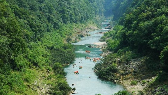 天下第一漂,起點哈妮宮距王村約40公里,行車1小時,終點牛路河距王村30分鐘的車程,漂流水路長17公里,漂流兩個半小時。從哈妮宮放舟而下,一路是古老的河道,絕壁百里,怪石嶙峋,灘奇水異,兩岸蒼翠的林木,云霧繚繞,飛瀑流泉與溶巖峰林交相輝映。拐一百五十五個彎,在一百三十三個灘潭中穿梭而行,迂回流連,馳魂奔魄,心曠神怡。
