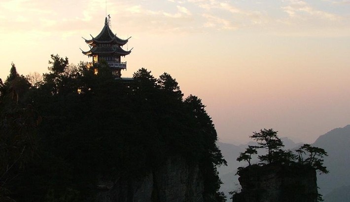 張家界黃石寨頂東頭,伸出一道約100米的山梁, 山梁盡頭有由兩塊砂巖相疊構成的一座觀景臺?;鶐r石面積約20平方米, 高5米左右;疊其上的巖石主10米,頂部為直徑約5米的平臺,周圍鐵欄圍護,一古松似傘,挺立其上。下臨幽谷,上頂云天。置身臺上,頭上白云飄拂,腳下幽谷翠峰。雨天云霧彌漫,周邊峰頂無窮變幻。皓月當空時,立于平臺上,滿天星斗似伸手可摘。1993年11月28日,時任國務委員兼國家經委主任的張勁夫同志,那天清晨,天邊上還殘留著幾顆星星,便迫不及待爬上這座石臺,版權所有山東聊城聊之旅國際旅行社有限公司,轉載必究!而對足下千百座石峰,信口吟詩道:“千峰竟秀,萬木蔥籠,琳瑯滿目,美不勝數。雖非大上,不似人間,借以喻此,不為過也。”為之命名。黃石寨東沿有一向外突出半截懸空的圓弧形觀景臺,因所處位置極高,臨百丈深淵,故名摘星臺。臺上可容10余人。置身高臺,環繞四周, 但見風云滾動,林泉奔突,奇峰異石,赴入眼底,遠水近景一覽無遺,大有“會當凌絕頂,一覽眾山小” 之勝。
