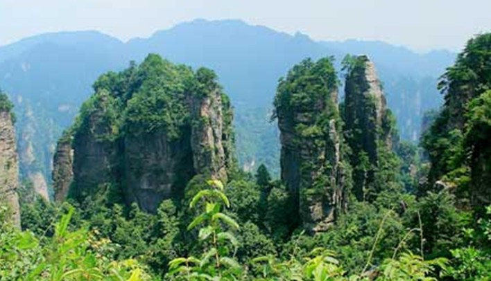 張家界黃石寨西北崖沿上,6座高達200多米的橢圓形石柱,呈南北向一字排開在黃石寨與袁家界之間約3000米長的溝谷中。石柱大小和間距相當,柱頂皆為平臺,似一排橋墩。中間兩墩稍高,兩邊漸次降低。各柱頂可連成一條弧線,氣勢滿壑,似一江怒濤,橋墩時降時現。若逢東邊日出西邊雨時,便如絢麗壯闊的彩虹南北飛架,與橋墩形成雙美合壁的奇觀。黑樅垴左側,黃石寨與袁家界之間幽谷深澗里,并排矗立著六座高數百米平頂巖峰,宛若一排被揭去橋面的橋墩,又象齊天大圣曾經碰壁的如來佛五指仙山。經風雨千年剝蝕割形成今日神奇景觀,山墩頂平面系古夷平面的可靠證據。