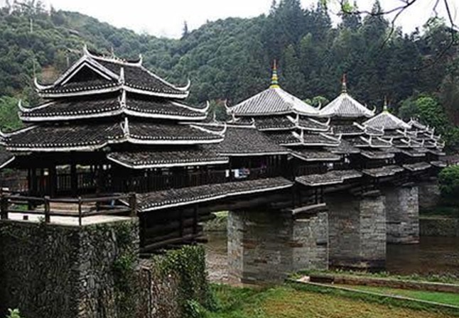 風(fēng)雨橋,也是侗族建筑藝術(shù)的一朵奇葩。在侗鄉(xiāng),縱橫交錯(cuò)的溪河上都建有風(fēng)雨橋,人們根據(jù)自己的愛(ài)好和河床的寬度大小,設(shè)計(jì)出各式各樣的風(fēng)雨橋,不過(guò)在眾多的風(fēng)雨橋中,以亭樓式的風(fēng)雨橋居多,這種風(fēng)雨橋于長(zhǎng)廊頂部豎起多個(gè)寶塔式樓閣,樓閣飛檐重疊,少的有三層,多的達(dá)五層。橋身莊重巍峨,如巨龍臥江,氣吞山河,十分壯觀。橋面兩側(cè)有精致的欄桿和舒適的座位,可供人們憩息。橋壁上或雕或畫(huà)有雄獅、蝙蝠、鳳凰、麒麟等吉祥之物圖案,形象詼諧灑脫,古香古色,栩栩如生。據(jù)傳,風(fēng)雨橋建在溪河上不僅僅是給人們交通提供便利,而且還有鎮(zhèn)邪和留財(cái)之意。