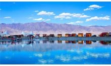 茶卡鹽湖與其它鹽湖不同的是,茶卡鹽湖是固液并存的鹵水湖,鑲嵌在雪山草地間而非戈壁沙漠上。鹽湖水域寬廣,銀波粼粼。天空白云悠悠,遠處蒼山崢嶸,藍天白云、雪山映入湖中,如詩如畫。四周牧草如茵,羊群似珍珠灑落。漫步湖上,猶如進入鹽的世界。