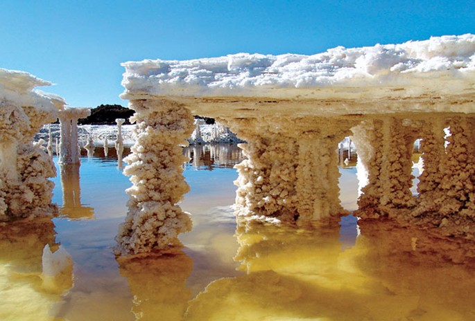 察爾汗鹽湖一切綠色植物均難以生長,但卻孕育了晶瑩如玉、變化萬千的神奇鹽花。鹽花是鹽湖中鹽結晶時形成的美麗形狀的結晶體稱謂。鹵水在結晶過程中因濃度不同、時間長短不一、成份差異等原因,形成了形態各異,鬼斧神工一般的鹽花。這里的鹽花或形如珍珠、珊瑚,或狀若亭臺樓閣,或像飛禽走獸,一叢叢,一片片,一簇簇地立于鹽湖中,把鹽湖裝點得美若仙境。每年前來觀看鹽花奇觀的國內外旅游者多達數萬人。