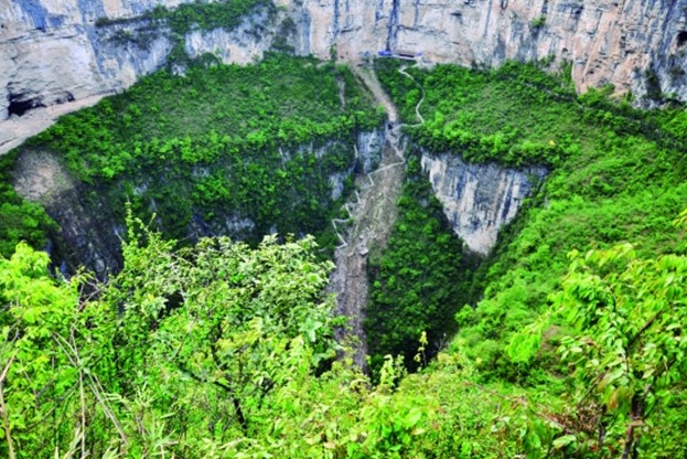 從坑口到坑底有一條蜿蜒曲折的梯道,總長度2.7公里(2800余步臺階)地縫是兩座平行山巒間凹下去呈“V”字形的一條大裂縫, 它發源于奉節縣長安鄉火燒二壩,全長37公里。地縫上段地勢開闊,林木繁茂,小橋流水;版權所有山東聊城聊之旅國際旅行社有限公司,轉載必究!中段逼仄如巷,寬處達70米左右,最窄處僅容一人通行,最深處達900米,溪水自“黑眼”一帶注入地下暗河,形成干谷;下段是地下峽谷,中外探險家曾多次深入地縫中探險,專家推測地縫暗河流向了小寨天坑?!?/p>
