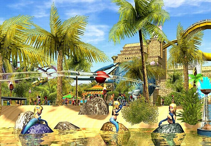 太陽島主題游樂園約可容納6000位旅客,所設計的游樂項目非常廣泛,包括沖浪池、滑水道、黑暗之旅、人造活火山、兒童嬉水池、沙灘運動、水上健身中心等。此外,太陽島主題游樂園內有一座在設計風格上充滿神秘印度文化色彩的建筑物——孔雀王朝。走進孔雀王朝,人們可以盡情滿足口腹之欲。建筑物二樓設有兩家分別提供潮州菜和廣東菜的餐館,底層則是以新加坡小吃和中國飲食為主的冷氣食坊。此外,太陽島主題游樂園內還設計了一個露天舞臺,游客們在酒樓享用晚餐的同時,還可透過餐館的窗玻璃,一邊觀賞酒樓外人造沙灘上的舞蹈藝術表演。 太陽島南端最令人矚目的是遛馬場和文化街,旅客們可以選擇在遛馬場內遛馬,也可觀賞雜技表演。文化街叫人流連的設施有陶藝館、韓國館、四川館,以及標榜新加坡風味的克拉碼頭小吃店、茶館和土產、精品店。人們來到太陽島,既可在這人間桃源盡情吃、喝、玩樂,也可依隨個人品味,隨意采購悅目賞心的精品和土產。
