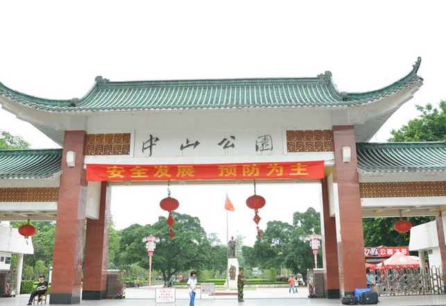 韶關市中山公園位于市中心區,湞江、武江、北江交匯處,總面積約12公頃。公園以中心大道為主軸線,形成了近三萬平方米開闊的公園城市廣場。主軸線上建有古典大屋頂琉璃瓦大門,孫中山雕像,音樂噴泉及文藝演出舞臺等建筑。廣場最高游人容量可達2萬多人。公園沿周邊規劃了兒童活動區、安靜休息區、盆景園、竹園以及水景區五個小區。