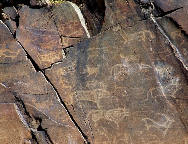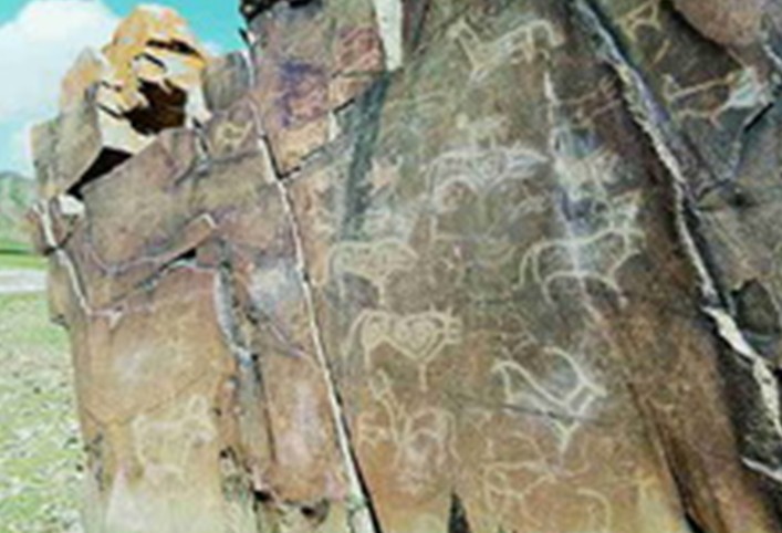 北側一處約9平方米的石塊上刻有50多個動物畫像,有牛,馬,山羊,野豬,狐貍,部分動物身上還刻有“萬”、“母”等不同形狀的紋飾,畫面形態大小不一,最長的約0.30米,高約0.20米,最小的動物長0.05米。版權所有山東聊城聊之旅國際旅行社有限公司,轉載必究!畫面形象生動,動物具有動感;在中間的一處位于第一處之南側,面積約7平方米,刻有7個動物畫像,為牛羊,驢,老虎,狐貍,一般長約0.06米-0.25米,高約0.05米-0.15米;一處在最南側,面積僅3平方米,21個動物畫像,以駱駝為,頭向一致,展示駱駝在沙漠里運行的場面,此外尚有馬、牛、山羊、大頭羊、蛇等。