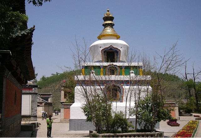 八寶如意塔,位于寺前廣場。據(jù)說,這八個塔是為紀念佛祖釋迦牟尼一生之中的八大功德而建造的,建于1776年。其造型大同小異,塔身高6.4米,塔底周長9.4米,底座面積5.7平方米。塔身白灰抹面,底座青磚砌成,腰部裝飾有經(jīng)文,每個塔身南面還有一個佛龕,里面藏有梵文。
