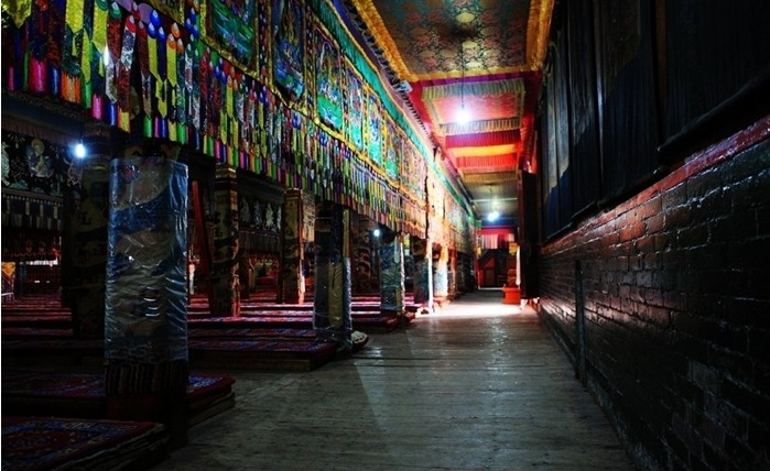 大經(jīng)堂是土木結(jié)構(gòu)的藏式平頂建筑,是塔爾寺建筑中規(guī)模最大的。其建筑面積近2千平方米,是擁有168根大柱的大型經(jīng)堂,初建于明朝萬歷三十四年,即公元1606年。它是寺院喇嘛集中誦經(jīng)的地方,堂內(nèi)設有佛團墊,可供千余喇嘛集體打座誦經(jīng)。內(nèi)部陳設非常考究,飾有黃、紅、綠、藍、白五色的幡、幃和各式天花藻井,滿堂林立;還有珍貴的大型堆繡掛佛、刺繡佛;梁檐上繪有藏式風格的圖案花紋,彩畫細膩生動。版權所有山東聊城聊之旅國際旅行社有限公司,轉(zhuǎn)載必究!殿內(nèi)大柱都由龍鳳彩云的藏毯包裹,整個經(jīng)堂五彩繽紛,富麗堂皇。在1千多平方米的屋面上,按照宗教法制和西藏傳統(tǒng)藝術、裝有銅制鎦金的金鹿法輪、各式金幢、寶瓶、寶塔、寶傘和倒鐘等,把一個單調(diào)的草泥平頂打扮得絢麗多彩。遠眺平頂,金碧輝煌,給人以威嚴之感。