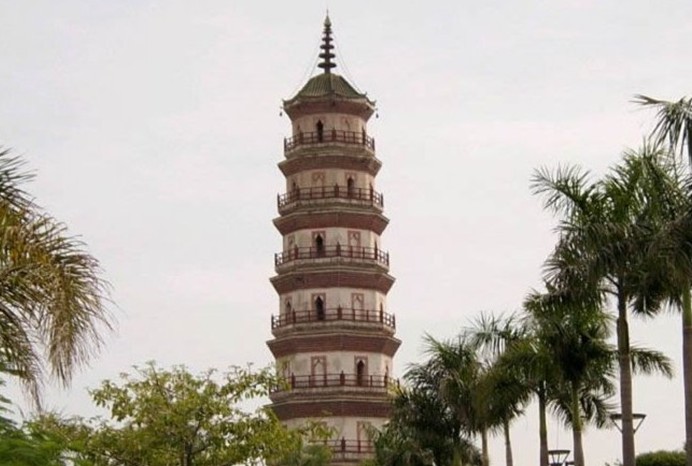 金鰲洲塔位于東莞市莞城西南1公里處,即萬江橋畔。因其座落于萬江金鰲洲,故名。金鰲洲古塔始建于明朝萬歷二十五年(1597年),合尖于天啟四年(1624年),歷時27年。據悉,建塔之目的為“以培風氣,亦堪興家所宜也”。原為抗御水害的鎮水寶塔,8角10層,蓋頂有塔剎,無塔檐,無欄桿,磚牙疊砌。后于清乾隆二年(1737年)重建,塔基距水邊僅三、五米之遙,此塔處于江心陸洲,三面環水,經二百五十多年,保存完整,基礎穩固,巍然聳立于東江之濱。