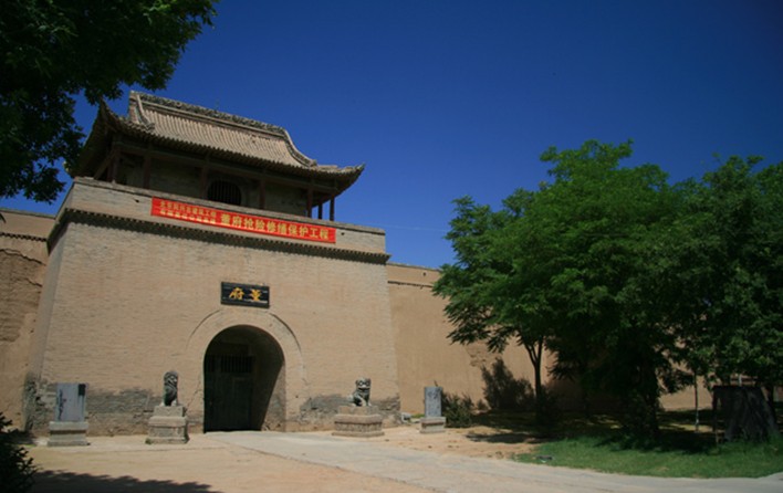 董福祥隨帶著清朝廷賜銀四千兩及親丁三千人,回到金積堡,買下鄉(xiāng)紳郭舉人的一片湖塘。1902年(光緒二十八年)開始了建蓋“宮保府”的龐大工程,歷時(shí)三年而成。初建是耗銀數(shù)十萬兩,動(dòng)用人工三百萬個(gè),耗糧250萬千克,占地百余畝。整體建筑有內(nèi)寨、外寨、護(hù)府河和主體建筑群落四部分組成,現(xiàn)僅存內(nèi)寨和主體建筑。