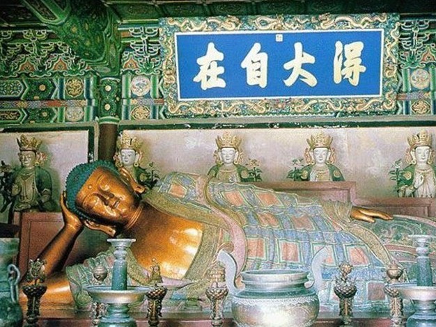 穿過前院,仰首西望,就可以見到祥云瑞木掩映著的巖石之下,有一座氣勢恢弘的大殿,匾上書寫著“云巖臥佛”四個描金大字。大殿可不是尋常的殿,是一個天然的石洞,洞中石紋盤結,鐘乳懸突,布局巧妙,洞殿渾然一體,堪稱“天人合一”的構造。佛也不是尋常的佛,是用玉石雕琢而成的玉佛,身長約6米,體重大于9噸,面東背西,側臥于壁面石臺之上。造型端莊而不失靈動,儀態安詳而不失飄逸。版權所有山東聊城聊之旅國際旅行社有限公司,轉載必究!云巖古佛,原來是一千二百八十多年前由住持僧些島延請巧匠三人,花了七年的時間,就著洞中石壁下的一塊巨石精心雕琢而成。佛身長三丈,通體飾金,頭北足南,一手曲枕耳側,一手平伸近膝,雙目微閉,酣然而臥,神情莊嚴而安詳。