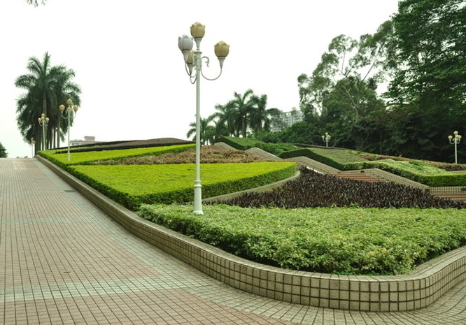 公園環(huán)境舒適,草坪舒展,山丘起伏,林木蒼翠,湖波粼粼,好一派自然清新的郊野風(fēng)情。氣勢宏偉的南北大門景色,門前廣場橫跨寬度達(dá) 100 米,建筑風(fēng)格獨特,植物色彩配置艷麗,布置緊湊,頗有現(xiàn)代公園氣派。最為壯觀的南門中軸廣場,兩側(cè)種植風(fēng)景林,配置各類棕櫚植物,襯托著中央的立體八角花壇,更加洋溢著嶺南園林的氣息。