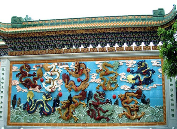 進(jìn)入南粵苑大門,迎面是一幅大型的照壁——九龍壁,這是“龍翔鳳翥”美景。九龍壁下有雕花青石底座,上有“玉包金”琉璃瓦蓋頂,四周是白玉石欄河。九龍壁有著王者氣派,顯示中華民族龍的文化源遠(yuǎn)流長(zhǎng)。為了突出龍的形象,制作者采用浮雕技術(shù)塑造燒制,很有立體感。在海水、祥云的映襯下,九條分別為黃色、紅色、紫色、白色、藍(lán)色的巨龍,喜戲龍珠,形態(tài)生動(dòng),翻騰自如,有如遨游滄海,又似騰飛九霄。特別是在陽光照射下,熠熠生輝,色彩斑斕,華美亮麗。