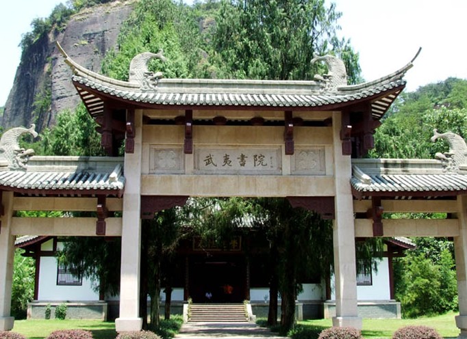造型莊重、嚴(yán)謹(jǐn)?shù)奈湟纳街祆浼o(jì)念館,是一座于1990年落成的廡殿式大院。館內(nèi)懸掛著新近書(shū)寫(xiě)的匾額、楹聯(lián),其中有不少聯(lián)文,語(yǔ)言精練、寓意深長(zhǎng),文彩斐然。古樸的大門(mén)上高懸著一塊大匾,題為“朱熹紀(jì)念館”五個(gè)醒目大字。是方毅同志在武夷山視察時(shí)留下的墨寶,莊重、蒼勁,有書(shū)法大家的風(fēng)范。朱熹在武夷山講學(xué)40余年,繼承和發(fā)展了理學(xué)體系。殿前大門(mén)兩側(cè)的草書(shū)楹聯(lián)表達(dá)了朱熹繼承和發(fā)展的深邃意義。