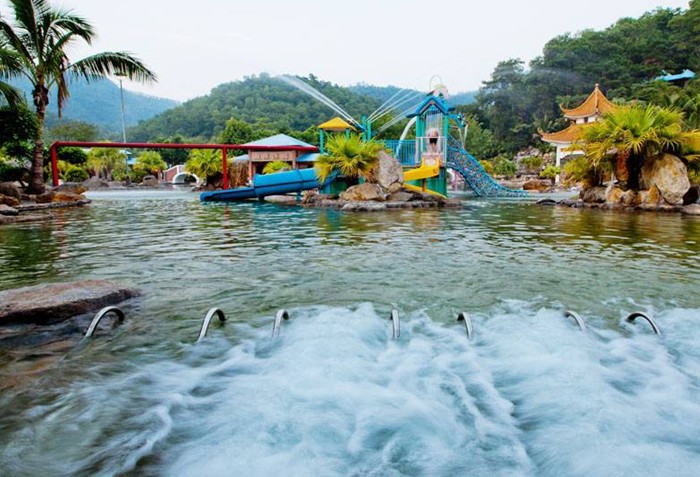 浴區(qū)內(nèi)有多處自噴溫泉,日流量為6000立方米,其溫泉水溫高達73℃,水質(zhì)晶瑩幼滑,并含有偏硅酸、氟、氫、硫等多種有益于人體健康的元素,屬優(yōu)質(zhì)醫(yī)療溫泉及罕有的溫滑泉。