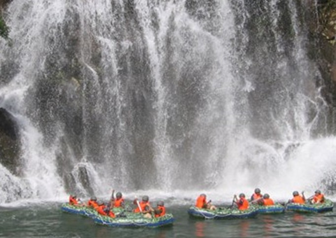 游客一進入景區,即置身于戰爭年代硝煙彌漫的烽火氛圍,游客換上專用的野戰軍服,組成一個個戰斗小分隊,在戰斗分隊長(導游)的帶領下,坐上披滿迷彩的運兵車,沿著充滿革命根據地氣息的曲折而平坦的深山林道向戰地指揮部(起漂點)行進。車上,戰斗分隊長向戰友們(游客)布置本次行動的任務,分析敵情,并作宣傳鼓動,領唱戰歌,高叫口號,使士氣空前高漲。經過十分鐘的行進,軍車到了目的地,在響聲震耳的瀑布聲中,更聽到了隆隆的炮聲,密集的槍聲,沿著峽谷峭巖古道而下,到了設在原始的飛天大瀑布旁邊的戰地指揮部,戰地參謀向戰友們訓話并講述了戰斗要點和注意事項(漂流的有關常識),然后次序坐上戰船順流而下(開始漂流)。