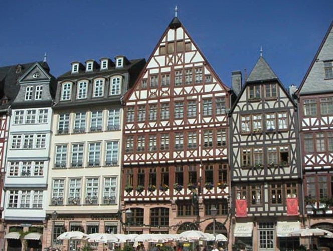 廣場的東側則有一排古色古香的半木造市民住宅。另有帝國大教堂(Kaiserdom),羅馬廳(Romer),還有圣尼古拉舊教堂(Nicolai Kirche)等。帝國大教堂建于1239年,有著哥特式的華美外表。它不僅是法蘭克福的精神中心,還曾是德國國王的加冕之地。在1562年—1797年間,共有10位皇帝在此舉行了加冕典禮。