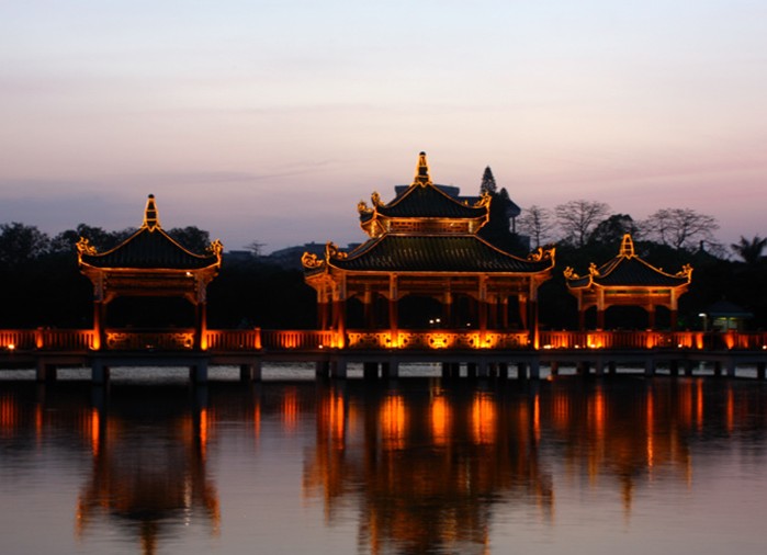 這是1986年建成開放的新景點。它采用中國庭園設計手法,庭廊相接,曲折回環。館中陳列著各種新奇花卉和盆景。這是一個小型花苑,如果對盆景有興趣的游客,在這里可以欣賞到很多各具特色的盆景,在“縮景為寸”的天地中領略到各處大自然的美景。宮苑里一年四季鮮花盛開,有不少是熱帶或寒帶才能生長開花的品種,所以這里又是一個鮮花鑒賞的新天地。這座宮苑開放以來,每天都接待不少海內外旅游團體和個人,他們都稱贊說:“這是南國獨有的一條風景線”。