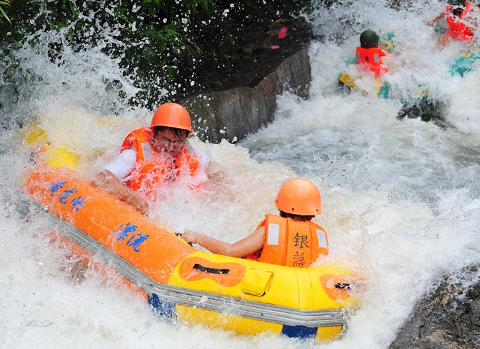 銀盞黃龍峽漂流——清遠漂流第一站! 銀盞黃龍峽漂流位于廣清高速銀盞收費站出口右轉8公里處(原國營銀盞林場),具有得天獨厚的地理環境和自然風光優勢,經漂流設計精英依山取材、精心打造,黃龍峽漂流河道在深山之中蜿蜒約4.3公里,河道首尾落差約108米,最高落差約20米,整條河道有幾十個跌差之多,一路白練碧潭、奇趣紛呈、驚險不斷,全國唯一的雙S回旋彎賽道及多個精心賽道設計讓游人真正體驗到挑戰自我的樂趣,而整個河道經年初精心整葺,煥然一新,水質大幅提升之余亦做足安全保障。
