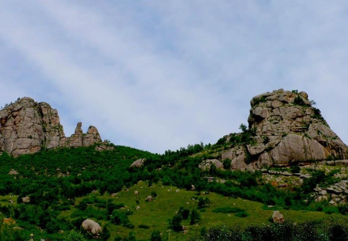 山上巖石千姿百態(tài),劈山石、仙人橋、一線天、崖洞等險(xiǎn)峻峭拔;醉臥雙獅、談心巖、三仙巖、望日臺(tái)等宏大雄奇;喇嘛巖、獨(dú)秀巖、母子巖、朝圣巖、望景峰、熊巖等維妙維肖,呼之欲出;香爐巖、臥馬巖、玉屏峰、繡球石等小巧可愛,形神兼?zhèn)?。諸峰渾然天成,橫縱俯仰,遠(yuǎn)近高低則景致迥異。喇嘛池、南八仙、中岳、南岳、烏龍洞,別有洞天,或巖、水、林相映成趣,或自鑄一格,別成一景。
