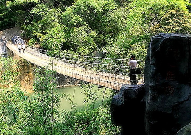 仙人橋位于縣城西南40余公里處的洛陽(yáng)鎮(zhèn)半星雷屋村,高山斜坡上、綠樹掩映間,有大、小拱天然仙人橋兩座,屬石灰?guī)r溶蝕地貌景觀。大拱橋高70米,寬50米,長(zhǎng)150米,小拱橋更為壯觀,高約138米,內(nèi)拱高106米,寬53米,長(zhǎng)約156米,在大拱仙人橋的入口處,有峰巒延綿,勢(shì)如雄獅回首南望,獅身高約38米,長(zhǎng)約60米,獅頭、獅眼因石灰?guī)r溶蝕脫落而成,形成了“雄獅回頭”的獨(dú)特景觀。