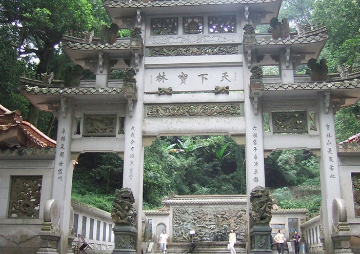 據明萬歷《曹溪通志》記載:南朝梁武帝天監元年,印度高僧菩提達摩東土弘法,歷經三年海上航行,首站登陸嶺南。見此地“山水匯合,峰巒奇秀,嘆如西天寶林山也”,遂建議地方官奏請武帝建寺。天監三年(公元504年),寺廟建成,梁武帝賜額“寶林寺”。唐儀鳳二年(公元677年)始,中國佛教禪宗創始人六祖惠能大師來寶林寺說法37載,使南宗禪法大播于天下。故南華寺素有南禪祖庭之稱,還與嵩山少林寺并稱為禪宗祖庭,在東南亞、朝鮮、韓國、日本以及歐美等國家和地區有重要影響。武則天萬歲通天元年(公元696年),武則天賜慧能水晶缽盂、磨衲袈裟等物。唐神龍元年(公元705年),中宗又賜寶缽、磨衲袈裟等物,并將寺名賜改為“中興寺”;神龍三年(公元707年)再改“法泉寺”。宋開寶元年(968),太祖賜額改稱“南華禪寺”,沿稱至今。1983年,南華寺被確定為全國重點寺廟。今南華寺占地總面積約42.5萬平方米,主體建筑群總面積1.2萬平方米。為階梯式中軸線對稱平面布局。寺向為坐北朝南。中軸線上由南至北依次為曹溪門(頭山門)、放生池(上筑五香亭)、寶林門(二山門)、天王殿、大雄寶殿、藏經閣、靈照塔、祖殿、方丈室。自天王殿始作封閉,東側依次為鐘樓、客堂、伽藍殿、齋堂等;西側依次為鼓樓、祖師殿、功德堂(亦稱西歸堂)、禪堂、僧伽培訓班等。主體建筑院落外,北側有卓錫泉(俗名九龍泉)、伏虎亭、飛錫橋;西側有無盡庵、海會塔、虛云和尚舍利塔;東側有中山亭。