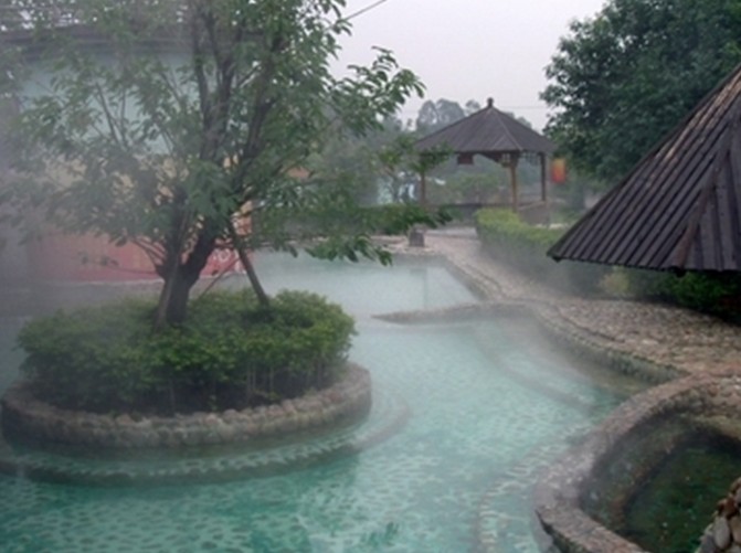 度假村經名山高人斟點依大風水格局,合溫泉自涌地點,北建天池面積200平方,分高、中、低溫池、水療臺靜動有諧,體會到一覽眾山小“百泉盡沐身,心靜滌塵埃,洗棄煩心事,又是好一天”的境界.南建八卦溫泉,把人的十二生肖鑲入八個卦位池,在泡溫泉中體會 “沐八卦,轉乾坤”的作用.龍華池(南天池)在村內最高點,有隔山湛凌兩水之能。南北之中:人工壘起一座山依圓潤四周來風,南北之中建有長50米,面積1000平方的溫泉游泳館,讓人們在運動中體驗溫泉水的作用。南北之中建一地下溫泉迷宮,在泡溫泉中體會“下地入宮尋往事,死去活來又一回”脫俗之感.東南建有保健中心,東北建有水上餐廳,正南和西南建有風格各異的賓館區和別墅區:有采用天然杉木按風水五行建成的水木龍華、金木龍華、土木龍華、火木龍華、杉木坊、杉木居、怡然閣和賓館A區、B區等居住區。以營造家庭氛圍,鄉土風情,風水與人體相合為主題,體會“日沐溫泉浴,夜聞鳥蟲鳴,春夢一覺醒,仿如在仙境”清心正本作用。