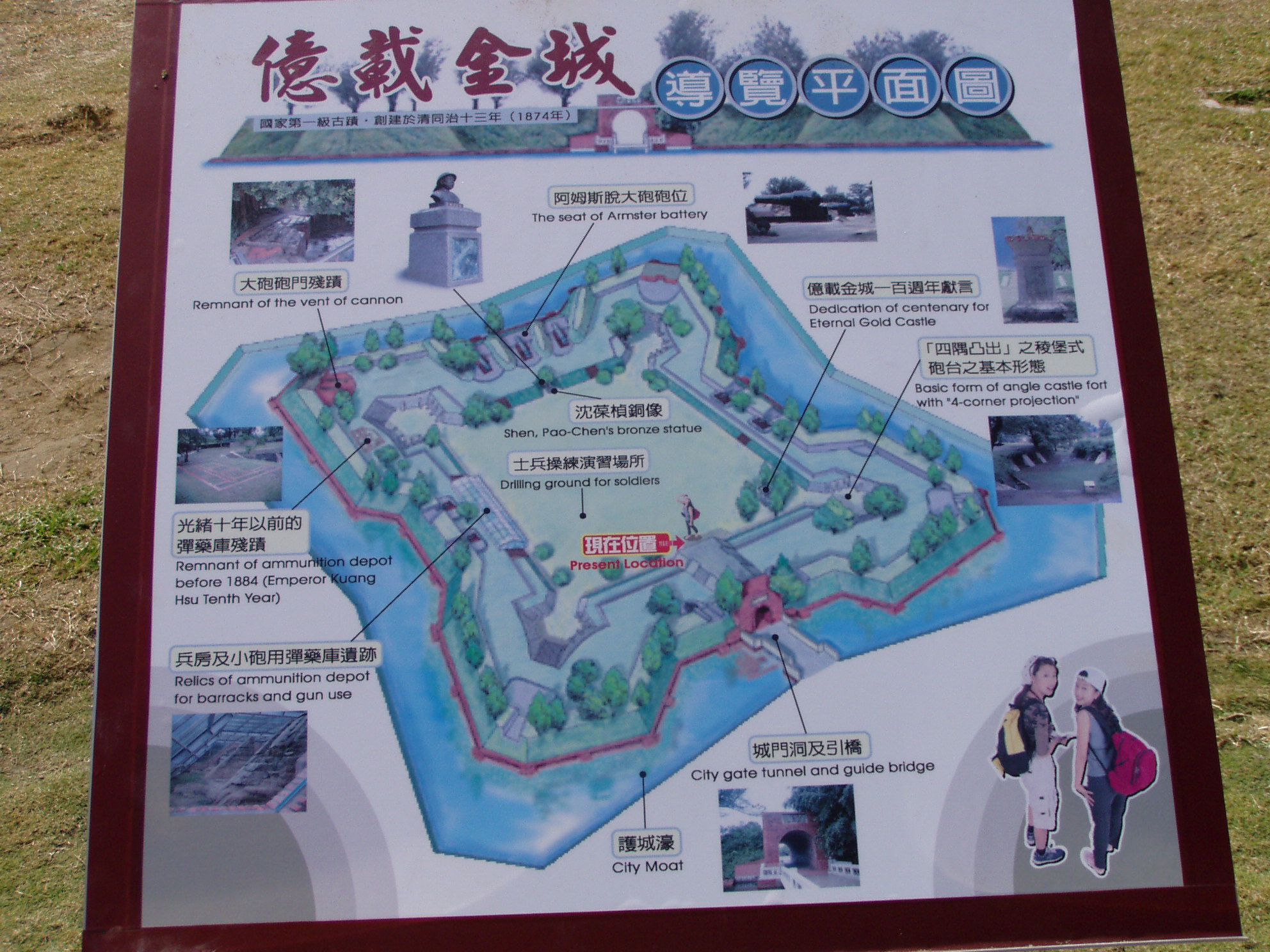 億載金城位在安平區南端,為昔日二鯤鯓之地,俗稱大炮臺,是清末為加強海防而筑的工事之一。建于清光緒2年(1876年),為臺灣第一座西式炮臺,直到1975年炮臺創建100周年,臺南市政府重加修葺,才恢復昔日舊觀,現已列屬一級古跡。