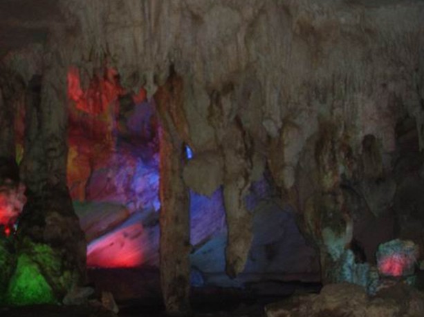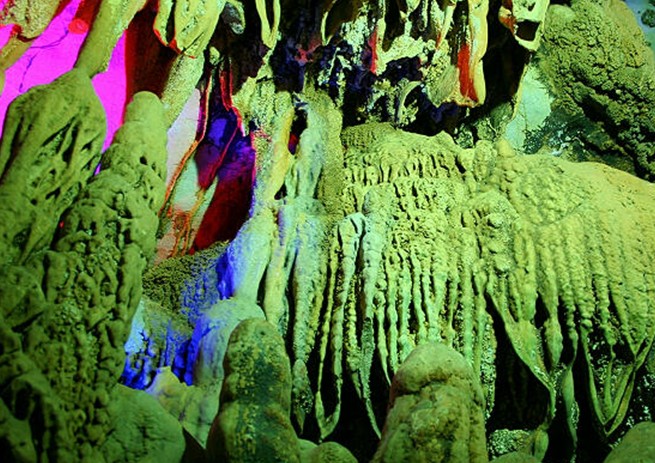 位于陽春市春灣景區內,巖洞全長1400米,龍泉溪水清澈,洞如長廊形,景物鬼斧神工、玲瓏剔透,有如龍宮之物。巖洞全程分四段:首段"迎賓廊","鐘乳寶塔"、"彩旗彩帶"招展,"石鼓"咚咚,"龍王水族"栩栩如生;次段是"龍王殿",兩側玉乳玲瓏,"龍宮浮雕"、"宮壁繡錦"惟妙惟肖;第三段為"聚寶庫",庫藏"鎮宮寶塔"、"定海神針"、"金玉龍床";第四段為"龍舟",其間石筍石幔琳瑯滿目,"龍宮羅帳"、"龍女寶鏡"、"龍女浴池"令人恍如身臨仙境。 大新縣龍宮巖又稱伏舊巖,國家二級景點。距縣城20公里,為喀斯特巖溶地貌。內有四廳,廳廳相連,廳內奇觀迭出,鐘乳、石筍、石花、石柱姿態各異,若獅若虎,似雞似鳥,或如蓮花朵朵,任由想象。更有層層天然水壩深潭,幽深清涼如入仙境。更為奇異者,第四廳中有一巨龍盤臥,鱗爪畢現,栩栩如生,令人嘆為觀止。