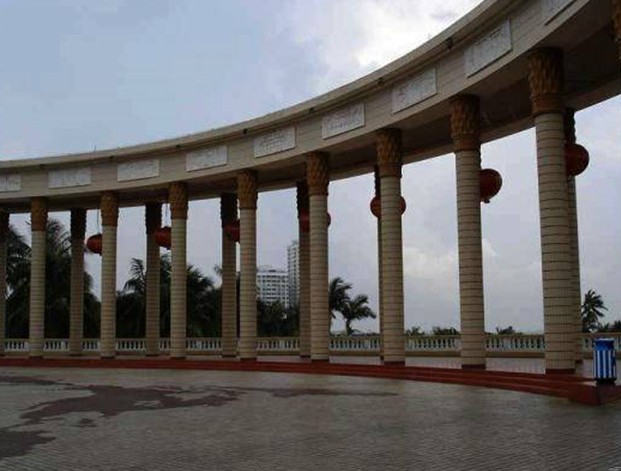 湛江海濱公園位于霞山區東北角海濱,這里有細白的沙灘、湛藍的海水、挺拔的椰樹,如茵的芳草,鮮艷的花卉。富有亞熱帶海洋風光,被稱為湛江的“城市客廳”。時代廣場就是公園的大門。大門為歐式建筑風格,由二十根圓柱頂起一弧形柱廊,上方鑲嵌著九幅漢白玉浮雕,浮雕描繪了湛江百年歷史,廣場地面用紅、褐、灰三色馬賽克拚成一幅世界地圖。圖中標明湛江的位置,也標出世界九個著名口岸,旁邊刻上湛江距離這九個港口的海上里程。時代廣場以其獨特的外形和豐富的內涵,成為湛江市一個新的城市標志物。