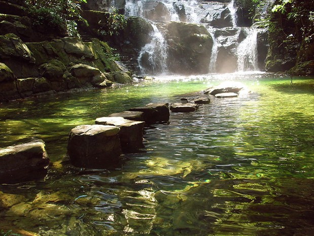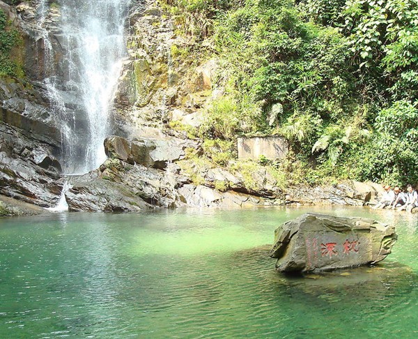 鼎湖山飛水潭,又名龍潭飛瀑,位于鼎湖山南半山腰、慶云古剎下東側。 去飛水潭,由榮睿碑亭拾級登山,沿曲徑云封直上,至半山腰向右拐,過眠綠亭即可。當然,亦可在榮壑碑亭前面的山溪邊起步,一直溯溪而上。這里,山石嶙峋,瀑布從40多米高的崖頂深處狂奔而來,直往下飛瀉,忽而形成千尺飛流,如白練懸空,忽而濺作滿空雨花,如輕紗曼舞。瀑布下,如注的水流匯成一泓碧水,中有巨石,上刻“枕流”2字。辛亥革命后,孫中山先生偕夫人宋慶齡游覽鼎湖山時,曾在此游泳,現崖壁上刻有宋慶齡手書的“孫中山游泳處”6個大字。潭水由此再往下傾瀉,版權所有山東聊城聊之旅國際旅行社有限公司,轉載必究!繼而形成另一個深潭,據傳為蟄龍窟,故曰:浴龍池。飛水潭側建有更衣室,崖間建有觀瀑亭,崖壁鐫刻著許多贊美飛水潭的摩崖大字和方寸小楷,如“噴雪”、“能移我情”、“天然圖畫”、“飛泉咽危石”等,頗有詩情畫意。 夏日到此,觀瀑、游泳、濯足,均感遍體清涼,煩熱頓消。