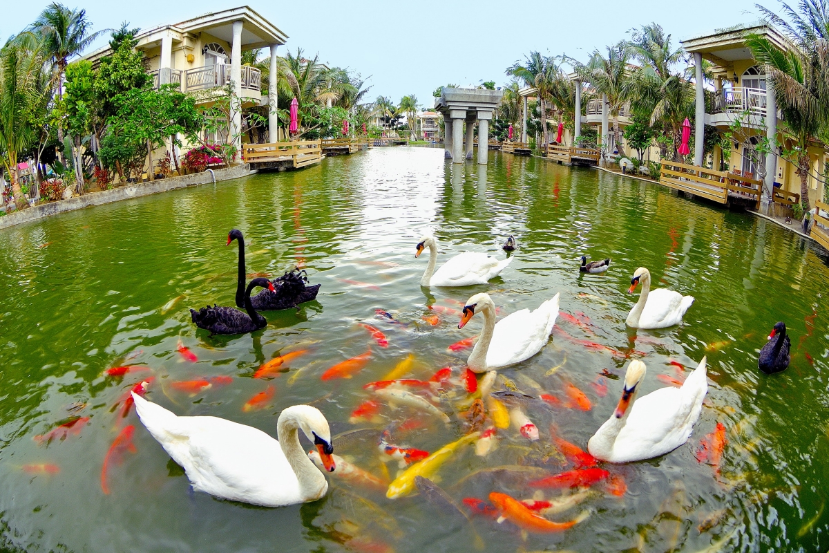 天鵝湖庫區南北長8公里,東西寬5公里,總面積近40平方公里,是杭州西湖面積的8倍;堤壩總長71公里,聊城旅游網版權所有聊城聊之旅國際旅行社有限公司,轉載必究!設計庫容1.14億立方米,年吞吐量2.2億立方米,是全國最大的濱海平原水庫。庫西側有棧道直通湖心的太陽島。太陽島分為4個部分,由"丁"字形棧道連接。第一部分位于進島東西棧道南側,主景為寶塔山及長城等;第二部分是位于東西棧道東端的中心島,是太陽島中面積最大的主景區,島上景點眾多,亭臺樓閣參差錯落,假山花圃錦繡迷人;第三部分是自中心島往南由棧道通連的南海景區,主景是"天涯"、"海角"等;第四部分是自中心島往北由棧道通連的北海景區,主景是北海白塔、荷蘭風車、鴕鳥園等。中心島設有游船碼頭,可乘游艇或摩托艇漫游湖區。有4個生物島布置在湖的4個角部。島上有鳥類百余種,其中珍禽有白天鵝、灰天鵝、黑天鵝、仙鶴等。湖中有魚類20余種,其中數量較多的有鯉魚、鯽魚、草魚、鲇魚、黑魚等。