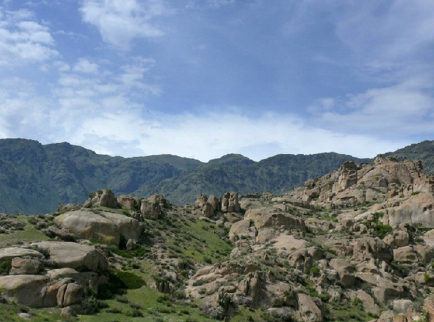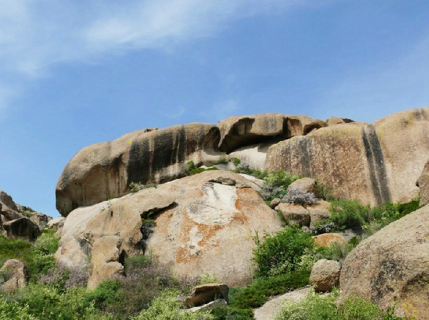 從博樂市北行偏東行38公里,就到了怪石峪。 怪石峪為一峽谷,然谷內無懸崖峭壁,也無峨峰刺天。整個山體,如人工用億萬巨石所砌。所砌之石,皆呈圓角,且有竅孔,石面光滑,無嶙峋之跡,令人稱怪,故稱“怪石峪”。當地哈薩克族同胞稱怪石峪為“闊依塔什”,意思是“遍地像羊一樣的石頭”。因為這些光滑的巨石,遠遠望去,如同羊群擠在山坡。