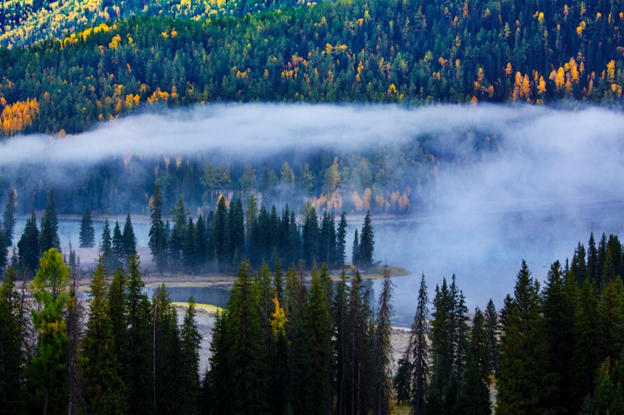 月亮灣往北大約3公里處有一片河灘,這里的河水將森林和草地切分成一塊塊似連似斷的小島,人稱神仙灣。版權所有聊城聊之旅國際旅行社有限公司,轉載必究!它實際上就是喀納斯河在山澗低緩處形成的一片沼澤淺灘,在陽光照射下河水流光溢彩,連樹上的葉子都隨風搖曳、閃閃發光,乍看去仿佛無數珍珠任意撒落。加上這里常有云霧繚繞、超凡脫俗、如夢如幻,使人看了如臨仙境一般。