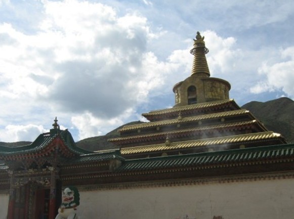 拉卜楞寺西南角,由三世貢唐倉(cāng)?貢曲乎丹貝仲美大師建成于1805年,原名現(xiàn)見解脫大金塔,因塔內(nèi)供有從尼泊爾迎請(qǐng)來的無量光佛(阿彌陀佛)像而享譽(yù)海內(nèi)外,寶塔造型別致,工藝精巧,在建筑藝術(shù)與宗教意義上達(dá)到了完美神圣之境界。現(xiàn)存寶塔由六世貢唐倉(cāng)?丹貝旺旭大師為丕振宗風(fēng),宏教利民,而于1991年2月8日在原寶塔遺址舉行凈地儀軌,主持籌建。