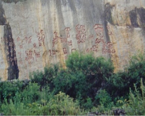 清道光《永寧州志》載:“曬甲山即紅巖后一山也,崔巍百丈。俗傳武侯南征曬甲于此。”又稱“紅巖山”。與關索嶺對峙,緊靠滇黔公路。從公路到紅巖前,約半公里。 紅崖向西,如墻似屏,長五十余米,高二十余米,呈淺紅色。偏北平整處,有形如古文字、非鐫非刻、非陽非陰的鐵紅色神秘符號書于淺紅巖面。字不成行,排列不整齊,錯落參差,大小不一,共有十九字。大者一米見方,小者十幾厘米。若篆若隸,古樸渾厚。雖經風雨剝蝕,但其色歷久不退?!栋岔樃尽罚?ldquo;殷高宗石刻,在永寧州(按當時州治,即今關嶺自治縣永寧鎮)東五十五公里紅巖山;《永寧州續志》,諸葛碑“在紅巖曬甲山懸巖上。約二十余字。大者如斗,小者如升。非篆非隸,不可辨認。字若朱畫,并非鐫刻。”