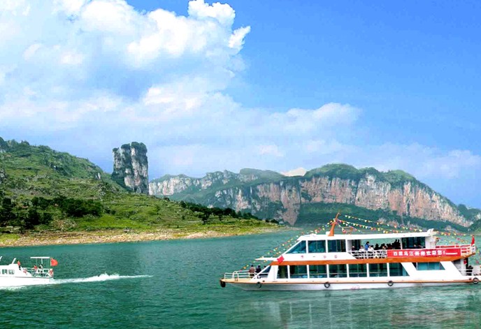 千里烏江發源于烏蒙山脈,北源六沖河,南源三岔河,都發源于貴州西部地勢最高的威寧彝族自治縣,兩條源流分別在深深的峽谷里流淌了幾百公里后,終于匯合成了烏江?!盀踅嬂取鄙衩乐P——東風湖。風光迷人,景色秀麗,兼有三峽的的雄奇,漓江的秀美。融高峽、平湖、溶洞、飛瀑等景色為一體,素來被譽為“山似山峽而水勝山峽,水似漓江而山勝漓江。”