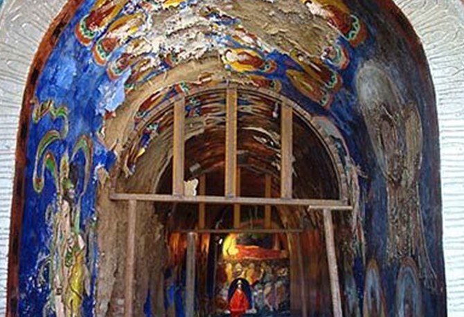 吉木薩爾千佛洞坐落在天山北麓距吉木薩爾縣城西南5km的黃土崗上,向北有小路與烏奇公路相通,交通便利.千佛洞建筑呈東西向的長方形,東面有山門。正殿坐西朝東,土木結(jié)構(gòu),南北兩則建有配房,磚木建筑。正殿為一有斗拱的硬山頂建筑,分前、中、后堂三部分。前堂塑有丈許高的釋加佛像一尊,中堂面闊三間,繪有佛說法圖,18羅漢等塑像;后堂塑有臥佛一尊;三部分緊密相連,構(gòu)成一個整體。