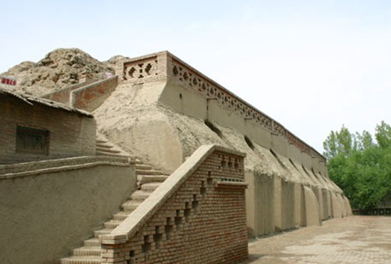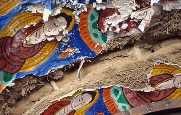 吉木薩爾千佛洞坐落在天山北麓距吉木薩爾縣城西南5km的黃土崗上,向北有小路與烏奇公路相通,交通便利.千佛洞建筑呈東西向的長方形,東面有山門。正殿坐西朝東,土木結(jié)構(gòu),南北兩則建有配房,磚木建筑。正殿為一有斗拱的硬山頂建筑,分前、中、后堂三部分。前堂塑有丈許高的釋加佛像一尊,中堂面闊三間,繪有佛說法圖,18羅漢等塑像;后堂塑有臥佛一尊;三部分緊密相連,構(gòu)成一個整體。寺院的西南搭有戲臺,供廟會組織的戲班所用原千佛洞始建于唐代,現(xiàn)千佛洞始建于清代,四建四毀。我們現(xiàn)在見到的是1993年由吉木薩爾佛教理事會募捐修建的,面目已同歷史上的千佛洞不同。壁畫、雕像均為現(xiàn)代工匠重新雕塑繪制。