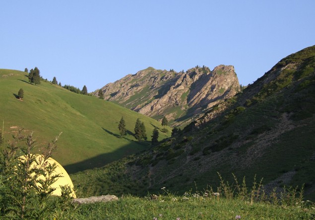 從烏魯木齊出發,抵達大河沿后,租用越野車或卡車至五星牧場扎營。這里就是徒步的起點。