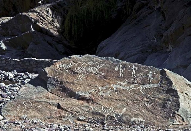 垂吉爾塔格山巖畫,位于托克遜縣城西北55公里處。在十幾、二十公里長的柯爾加依溝的山丘石壁或墜落的土黃色砂巖上,分布著數十幅栩栩如生、形態各異的古代巖畫。巖畫有放牧、狩獵和引水灌溉等圖案,以動物為主,有鹿、駱駝、豹、虎、狼、狗,最多的是大角羊。 畫中人物或行或立,或射箭或騎駱駝,他們頭戴大皮帽,腳穿長腰靴,腰部束帶,雄姿勃發。