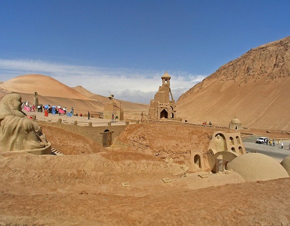 大漠土藝館文位于新疆吐魯番火焰山下。煙云繚繞的火焰山下,郁郁蔥蔥的木頭溝河畔,一座規模宏大的人文景觀以其獨特的藝術風格,屹立在312國道西側,它就是1991年5月對外開放接待游人的新疆火焰山大漠土藝館,地理坐標89°32″7′,42°56″8′,海拔140米。這里是火焰山腹地的五百羅漢谷,是佛光寶地。眾所周知,自古名山僧占多,火焰山也不例外,著名的佛教遺址--柏孜克里克千佛洞就開鑿在此谷。