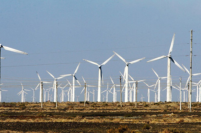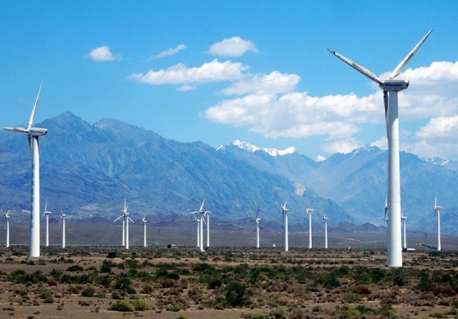 在烏魯木齊去吐魯番的途中,沿路南行,在通往絲路重鎮(zhèn)達(dá)坂城的道路兩旁,上百臺風(fēng)力發(fā)電機擎天而立、迎風(fēng)飛旋,與藍(lán)天、白云相襯,在博格達(dá)峰清奇峻秀的背景下,在廣袤的曠野之上,形成了一個蔚為壯觀的風(fēng)車大世界。這里就是目前我國最大的風(fēng)能基地——新疆達(dá)坂城風(fēng)力發(fā)電廠。