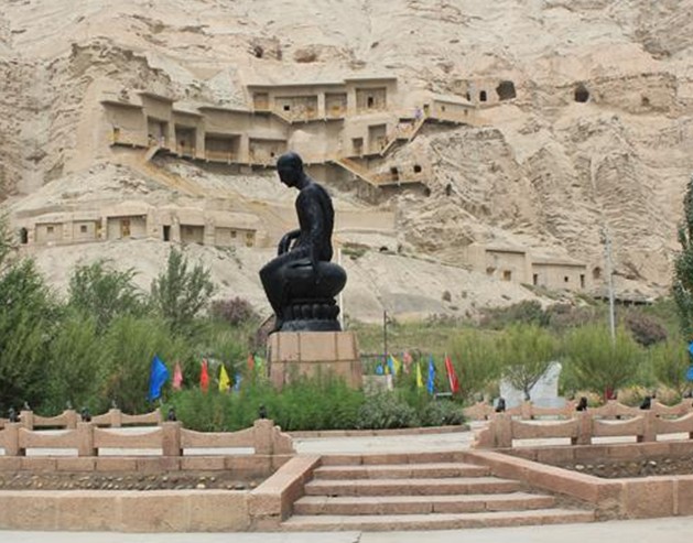 據考證,我國古代有名的高僧 —— 鴆摩羅什出生在龜茲。他的母親是龜茲王白純的妹妹。他 7歲出家, 9 歲跟隨母親到了北天竺,在名僧盤土多達多處學習佛經。 12 歲時,同母親一起返回龜茲。龜茲王聽說他回來了,親自遠迎,并專門為他造了金獅子座,以大秦錦褥鋪之,并請他升座說法。西域各國國王一見他升座,都在他的座側聽講。 公元 401 年,鴆摩羅什到了長安,后秦王款待他以國師之禮。從此,他就在長安國立譯場逍遙園,從事佛經的翻譯,與直諦、玄奘并稱為我國佛教三大翻譯家。他和他的弟子共譯出佛經 74 部, 384 卷, 對我國佛教文化做出不可磨滅的貢獻。《梁書》記載,漢武帝時有 “ 外國澡罐一口 ” ,銘云:“ 元封二年,龜茲國獻。 ” 說明在 2000 年前,佛教在龜茲已普遍傳布,而且澡罐這種佛教器物被作為一種貴重禮物獻給了漢武帝。鳩摩羅什銅像矗立在克孜爾石窟前。鳩摩羅什是中國四大佛經翻譯家之一。