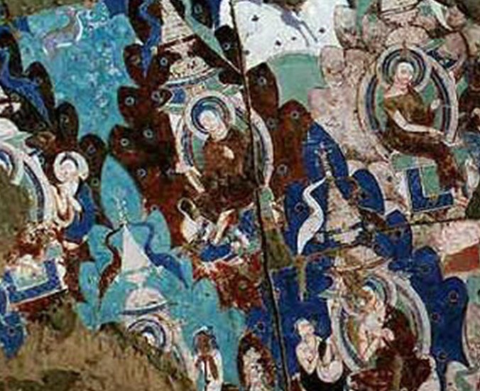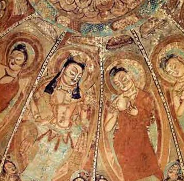 由于唐代是龜茲地區(qū)佛教的鼎盛時期,因此盛唐時開鑿的洞窟較多。在庫木吐拉石窟中,唐代的壁畫數(shù)量最多。它在內(nèi)容和畫風上都和中原藝術(shù)比較接近。這一時期的主要特點是:既有中原畫那種豐富多變的線條,又有凹凸暈染法,并使二者有機地結(jié)合在一起,形成獨具一格的龜茲畫風。它運用了富有裝飾性的圖案作背景,以寫實傳真的空間,來襯托虛幻的宗教故事。這種手法,大量地使用在滿鋪窟頂?shù)牧飧癖旧⒁蚓壒适庐嫼土飧耠p幡復(fù)缽式塔內(nèi)的坐佛圖上。在橫豎斜向排列的菱格中,又畫出層層山峰,其間點綴著圖案化了的樹木、花卉、水池,再彩繪以形象生動、造型優(yōu)美的佛本生或因緣故事畫,使之動靜結(jié)合,圖案與寫實相呼應(yīng),主題形象突出,色彩濃淡相宜,畫面絢麗多彩,又富有裝飾意匠。