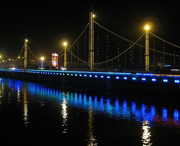 孔雀河橫穿庫(kù)爾勒市區(qū),把庫(kù)爾勒市分為南北兩半,北面以州市地方單位為主,南面以塔里木勘探開(kāi)發(fā)指揮部及石油單位為主。在市區(qū)長(zhǎng)達(dá)七公里的孔雀河上共有五座橋,有孔雀河大橋、獅子橋、建設(shè)橋、團(tuán)結(jié)橋等。上游的孔雀河大橋是314國(guó)道跨越孔雀河上目前最大的橋梁,橋跨150米,寬24。5米,是我國(guó)西北地區(qū)最大的一處拱形鋼橋,河面無(wú)橋墩,它是孔雀河在庫(kù)爾勒市區(qū)的一處重要景觀,是孔雀河濱風(fēng)景旅游帶上一道獨(dú)特風(fēng)景線。近些年庫(kù)爾勒市從實(shí)際出發(fā),利用孔雀河穿城而過(guò)的優(yōu)勢(shì)建設(shè)了孔雀河風(fēng)景旅游帶工程。風(fēng)景帶基礎(chǔ)設(shè)施完善,綠草如茵、鮮花怒放、景色宜人,成為市區(qū)一道亮麗的綠化美化線和旅游風(fēng)景線。一方水土,因風(fēng)雅而美麗;一座城市,因歷史的積淀和教養(yǎng)而文明。版權(quán)所有山東聊城聊之旅國(guó)際旅行社有限公司,轉(zhuǎn)載必究!現(xiàn)在的孔雀河市區(qū)段玉水如帶,百步一景。清晨,薄霧輕紗,爽氣怡人;晚間,夕陽(yáng)鋪水,依稀將人帶入夢(mèng)中仙境。早晨鍛煉身體的人在這里吐故納新,采天地之精華;傍晚,休閑的人們?cè)谶@里納涼散步,觀夜景之妙。如潮的人流摩肩接踵,使孔雀河畔洋溢出一種節(jié)日的氣氛。