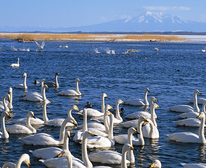 在新疆巴音布魯克草原中心地帶的巴音烏魯鄉以北 2公里處,有一條東西長30公里、南北寬10公里的高山湖泊,海拔2500~3000米,湖水瀠回如帶、清澈見底,水中生長著大量水生植物,四周群山環抱,綠草如茵,高山雪嶺倒映湖中,形成神奇迷離的自然景觀。每逢春末夏初,冰雪消融,大地復蘇,旅居在印度、緬甸、巴基斯坦,甚至遠到黑海、紅海和地中海沿岸諸國的天鵝和雁鷗,不遠萬里,成群結隊地飛到這里筑巢、換羽、求偶、生兒育女、棲息繁衍。這就是我國著名的巴音布魯克天鵝湖自然保護區。天鵝湖鳥類資源十分豐富,水禽種類多、數量大。據考察這里有大天鵝、小天鵝、疣鼻天鵝一萬余只;還有灰雁、斑頭雁、白頭鷂、燕鷗、白鷺等 100多種水鳥。其中灰鶴、黑鶴、羽鶴、大白鷺、金雕、禿鷲、胡兀鷲近10種珍稀鳥類,屬國家一、二級保護動物。秋末時節,天鵝們帶著各自“小寶貝”,時而歡騰在熱鬧的湖水中,時而擊水而起,版權所有山東聊城聊之旅國際旅行社有限公司,轉載必究!騰飛高空鍛煉著飛越千山萬水的本領。陽光下天鵝、湖水、山峰和云影構成一幅“片水無痕浸碧天,山容水態自成圖”的畫卷。巴音布魯克能夠成為天鵝的故鄉,不僅得益于這里獨特的地理環境和獨特的氣候條件,而且得益于當地蒙古族牧民把天鵝視為貞潔之鳥、美麗的天使、吉祥的象征加以非常的愛護。保護站在天鵝湖畔的高地建有一座瞭望臺,可供旅游者觀察天鵝的生活動態。