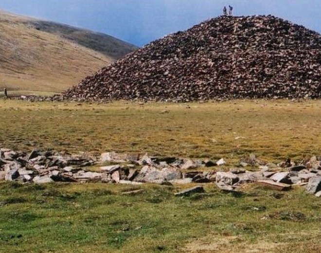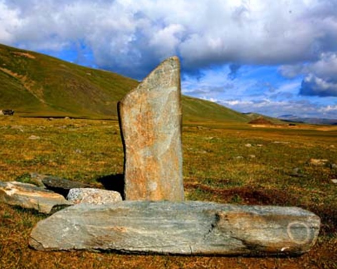 三海子墓葬及鹿石位于新疆維吾爾自治區(qū)青河縣查干郭愣鄉(xiāng)三海子夏牧場,為青銅時代的一處墓葬,距今約4000年。在面積約16.25平方公里地域的四個分布區(qū)內計有石圍石堆墓、石棺墓30余座,鹿石19通。什巴爾庫勒石圍石堆墓,石堆直徑78米,殘高25米;石圍直徑210米,寬3~5米。石堆與石圍之間有四條片石鋪成的通道,最寬的通道達1.6米。墓環(huán)水而建,氣勢宏偉,結構獨特,是歐亞草原少有的特大規(guī)模墓冢之一。